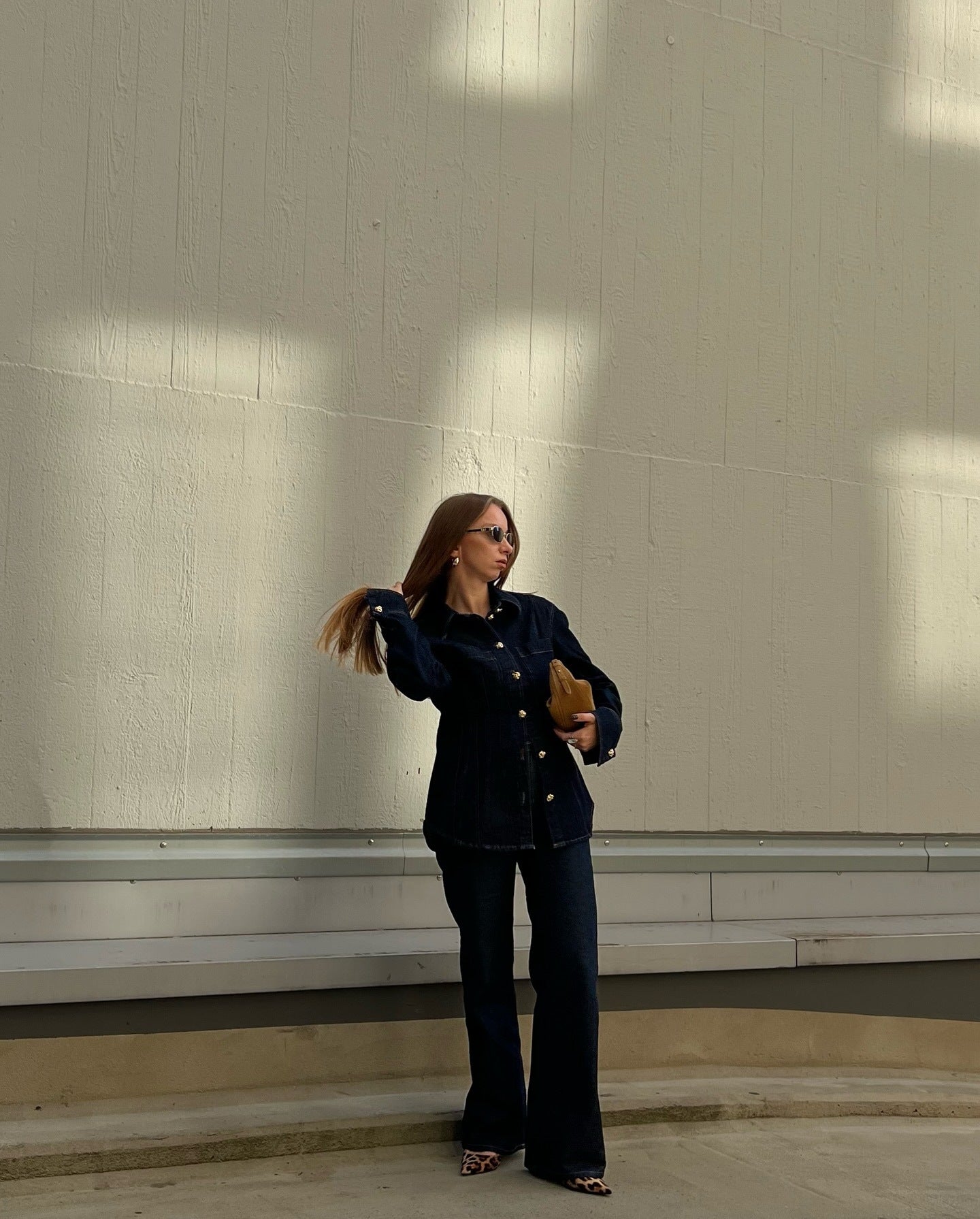 Deze denim co-ord set is stoer, trendy en super veelzijdig. De set bestaat uit een flared jeans en een bijpassende blouse met gouden knopen. Gemaakt van stevig maar comfortabel denim, waardoor je hem het hele jaar door kunt dragen. Draag de set samen voor een complete look, of combineer de items los met je favoriete basics.