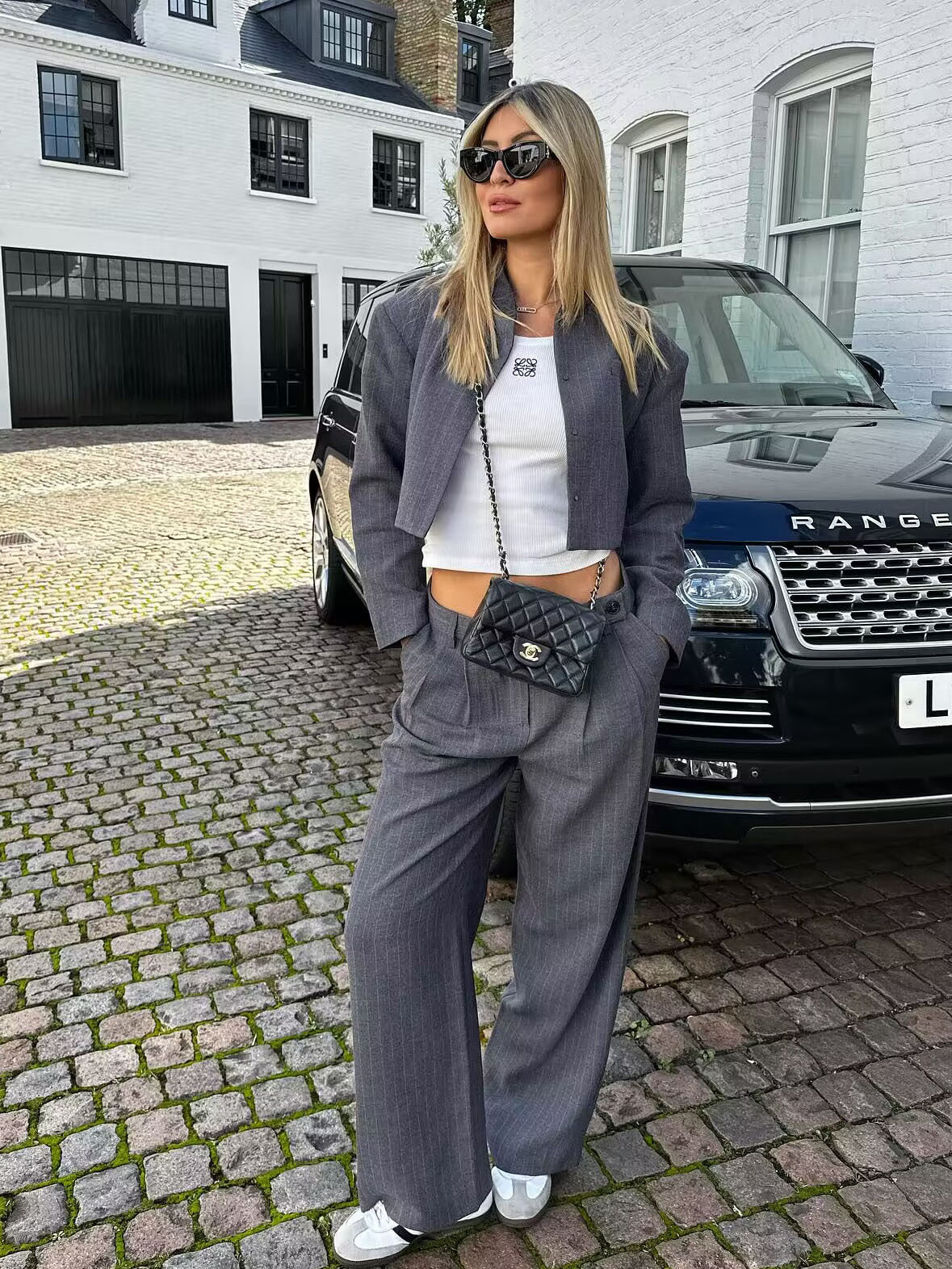 Je kunt de blazer en broek samen dragen voor een complete look, of los combineren met andere kledingstukken. Verkrijgbaar in klassiek grijs en beige – kleuren die overal bij passen.