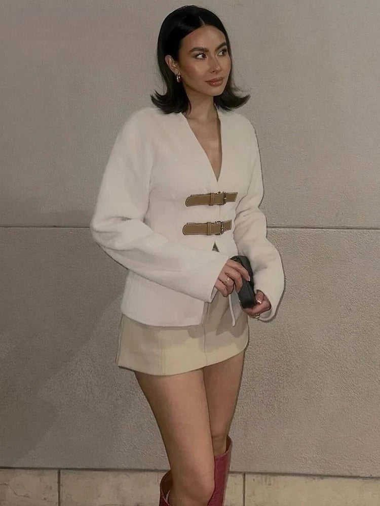 Anne | Wollen Jasje Dames | Elegant Kort Winterjasje Met Leren Gesp